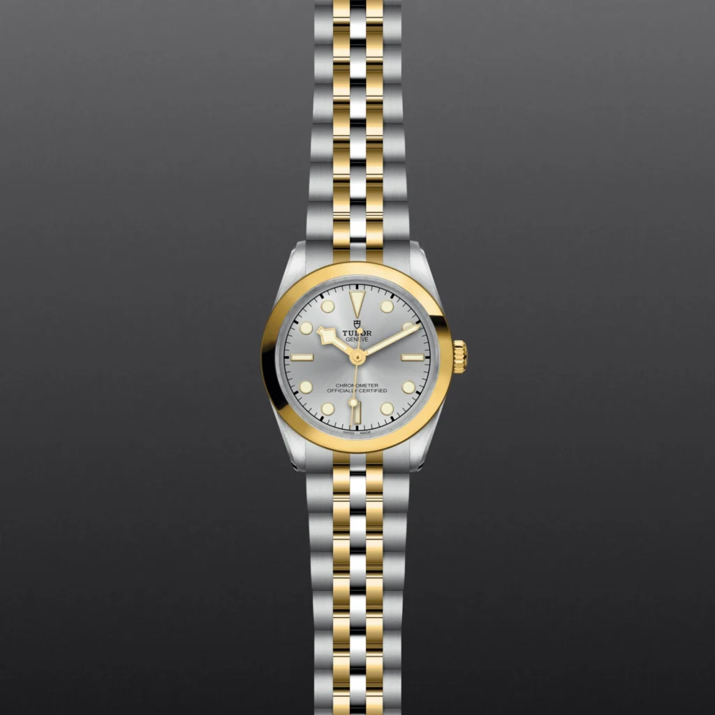 Black Bay One 31 S&G M79603-0002, Luneta giratória unidirecional, Bracelete em titânio ou aço, Caixa de tamanho variável com acabamento acetinado, Bezel com disco em cerâmica e material luminescente, Calibre de Manufatura com certificação COSC ou METAS, Movimento mecânico de corda automática, mostrador com acabamento sunray ou mate, Cristal de safira, estanque até no mínimo 200 metros, Bracelete com fecho TUDOR T-fit, extensões e opções adicionais incluídas na caixa.
